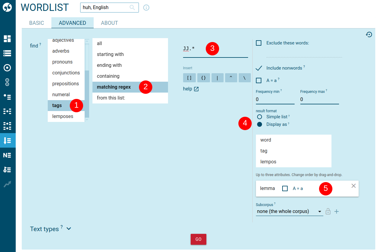 This way, Sketch Engine will find all words tagged as the regular expression you created, but the result list will be displayed as another attribute. Please, be aware that using the option 'display as' takes way longer than simple list and some statistics (document frequency, ARF, ...) aren't available in the results. Therefore, it should be used only when it is necessary.